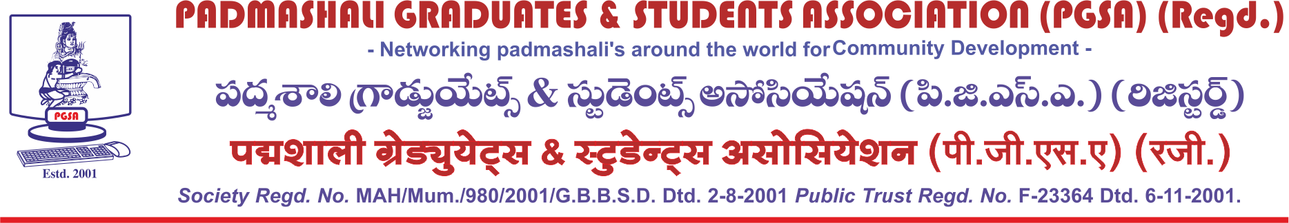 PADMASHALI GRADUATES & STUDENTS ASSOCIATION (Regd), in short it is called - PGSA, is formed in the year 2001 by a group of young, dedicated & energetic Padmashali Graduates to work for the welfare and development of the students of our community in all spheres of life. Since then PGSA has been working relentlessly for promoting this cause and successfully organised a number of activities.